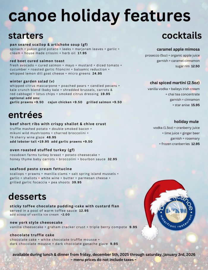Our featured Blue Canoe holiday menu is available beginning Friday, December 5th, 2025 through Saturday, January 3rd, 2026. Call to reserve a table: 604-275-7811