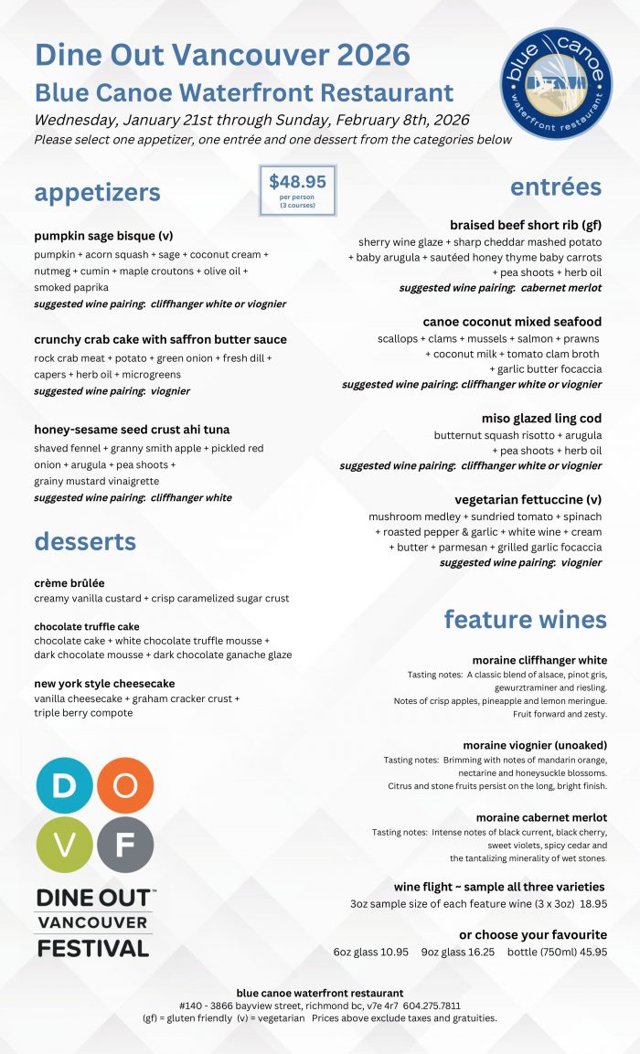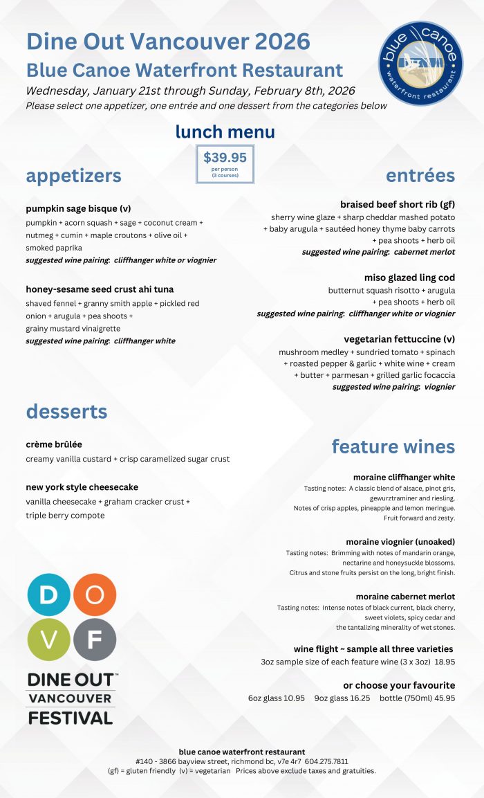 Blue Canoe is excited to be part of Tourism Vancouver’s Dine Out Vancouver Festival for 2026. We are featuring special 3-course menus for lunch and dinner with select wine pairings from BC wineries. Dine Out runs from Wednesday, January 21st through Sunday, February 8th, 2026.