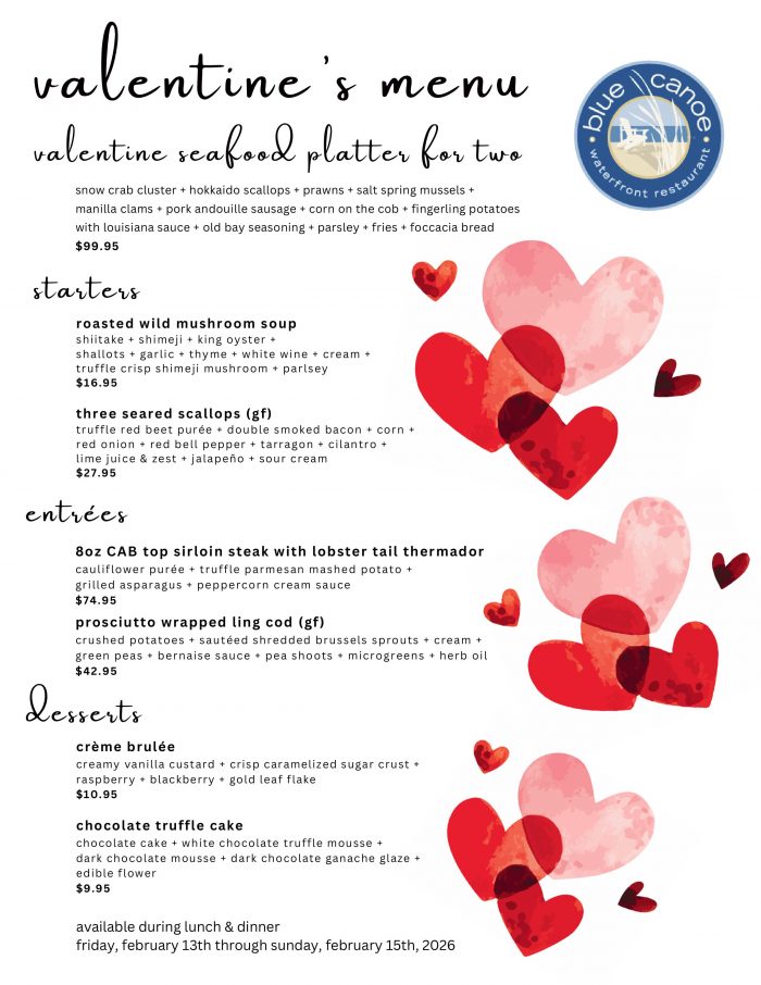 Feb 11 By Blue Canoe Categories Latest News Share Tweet Valentine’s Weekend 2026 A special Valentine’s menu will be on offer from Friday, February 13th through Sunday, February 15th